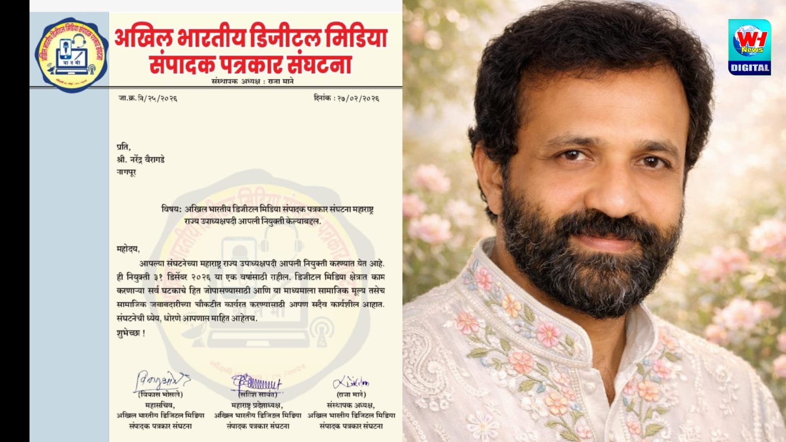नागपुर WH NEWS : मीडिया जगत के लिए गौरवपूर्ण समाचार है कि वरिष्ठ पत्रकार नरेंद्र वैरागड़े को अखिल भारतीय डिजिटल मीडिया संपादक पत्रकार संघटना में राज्य उपाध्यक्ष पद पर नियुक्त किया गया है।