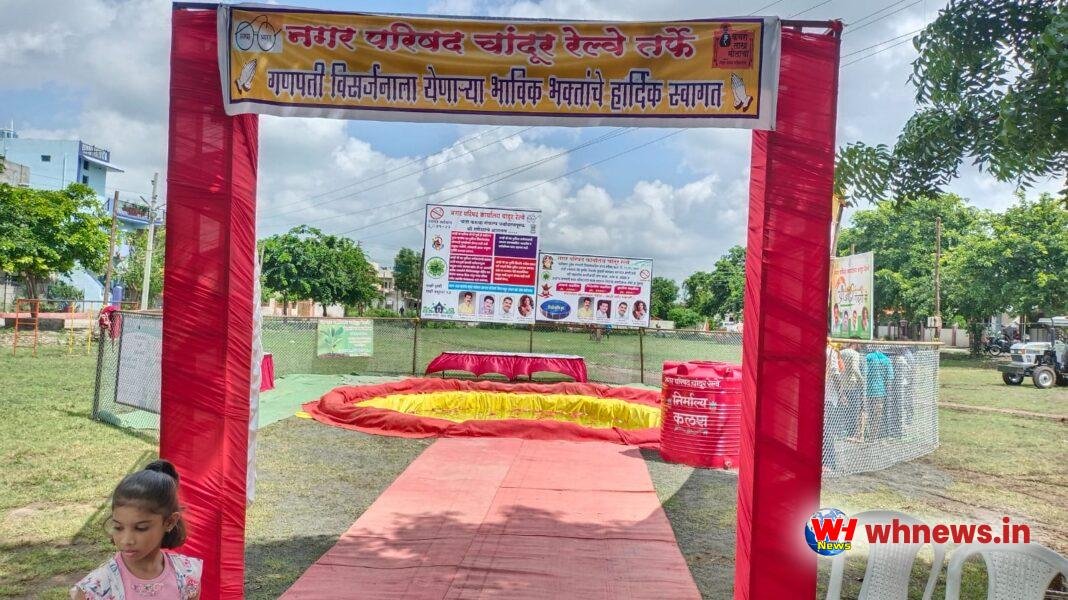 WH-NEWS( मंगेश बोबडे)अमरावती :-चांदूर रेल्वे नगर परिषद की और से स्वच्छ भारत अभियान तथा माझी वसुंधरा अभियान के अंतर्गत शहर में राम नगर स्थित मैदान पर कृत्रिम तालाब का निर्माण किया गया है। इस परिसर में भव्य पडाल डालकर पुष्प माला,कमल के फूलो से सजाया गया है साथ ही साथ परीसर को सुशोभित करने हेतु रंगी-बी-रंगी पताका लगाई गई है। इस लिए कार्यक्रम के लिए प्रथम,व्दितीय,तृतीय बक्षिस भी रख नागरीको से आवाहन किया गया है की पर्यावरण तथा पानी को शुध्द रखने के लिए यह कार्यक्रम रखा गया है। गणपती विसर्जन के समय तालाब,कुँऐ पर बच्चे डूबने की घटना होती है गणपती मूर्ती के कलर से पानी दूषित होता है। प्लास्टर आॅफ पॅरीस कि मूर्ती पानी में नुकसान दायक होती है। इस लिए यह अनौखा कार्यक्रम पिछले साल से नगर परिषद ने सुरू किया है। इस वर्ष शहर की जनता से निवेदन किया गया है कि अपने गणपती बाप्पा का विसर्जन विधिवत् तरीके से इस कृत्रिम तालाब में करे ऐसा आह्वान उपविभागीय अधिकारी इब्राहिम चौधरी,मुख्याधिकारी उरकुडे,आरोग्य निरीक्षक राहुल इमले ने किया है। तथा राजे छत्रपती गणेश मंडल की और से फोन की सुचना पर घर पोच गणपती विसर्जन की सुविधा मुहैया की जा रही है। इस लिए मंडल ने एक मोबाइल क्रमाक दिया है फोन करने मंडल की टीम घर पर आकर गणपती बाप्पा का विसर्जन करेगे