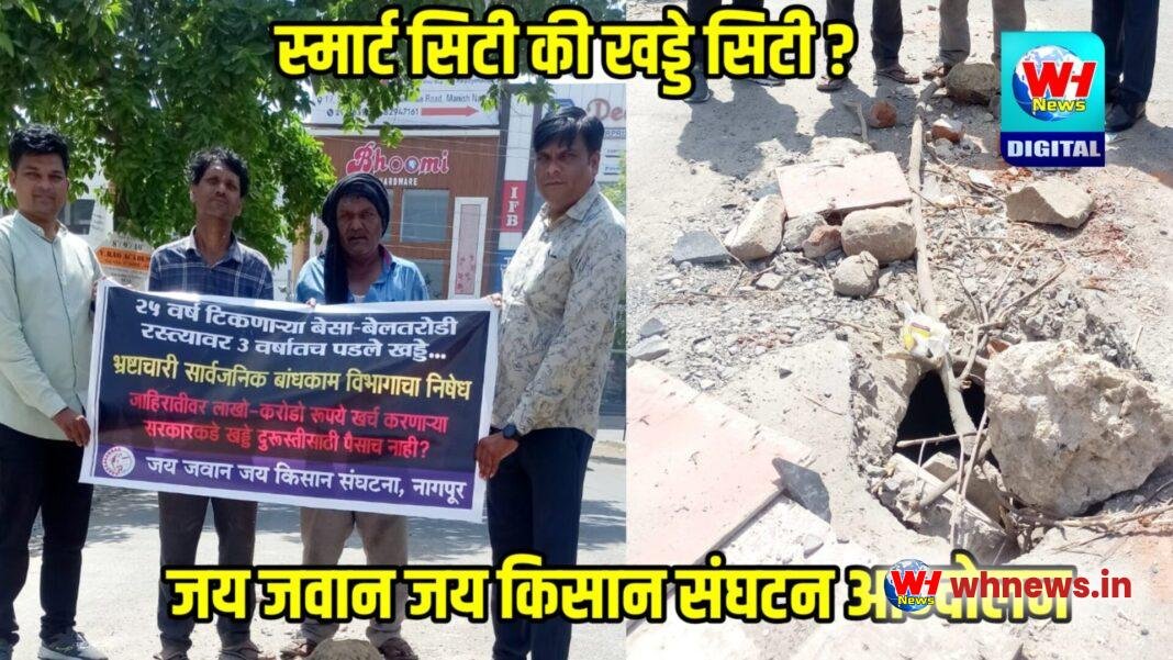 बेसा ते मनिष नगर टी पॉइंट येथे सिमेंट रोडवर महिनाभरा पासून 5 फूट खोल खड्डा पडून अनेक अपघात झाले असून या विरोधात जय जवान जय किसान संघटनेच्या वतीने सार्वजनिक बांधकाम विभागाच्या विरोधात नारे बाजी करण्यात आली. जाहिराती वर करोडो रुपये खर्च करणाऱ्या सरकारकडे खड्डे बुझवण्याकरिता पैसे नाही का ? हा प्रश्न उपस्थित होतो. 2019 ला या रस्त्याचे बांधकाम करण्यात आले. 20 ते 25 वर्ष टिकणारे सिमेंट रस्त्यावर खड्डे पडतात कशे याची चौकशी झाली पाहिजे. सार्वजनिक बांधकाम विभागाच्या भ्रष्टाचारामुळे या ठिकाणी अपघात मोठ्या प्रमाणात होत आहे असा संघटनेचा आरोप आहे.